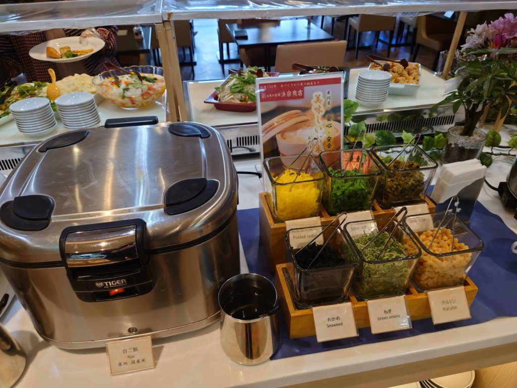 御飯は当然あります。お漬物にお味噌汁もあります。わかめやネギも入れ放題!