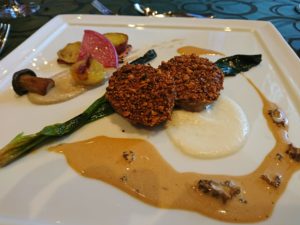 肉料理ですが子羊にヘーゼルナッツをまぶしてステーキにしてます。