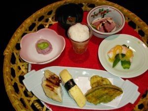 手前から握り寿司2種・天ぷら2種・海老とオクラの辛子酢味噌・