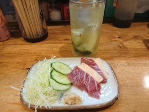 2杯目は緑茶ハイと馬刺しをお願いしました。